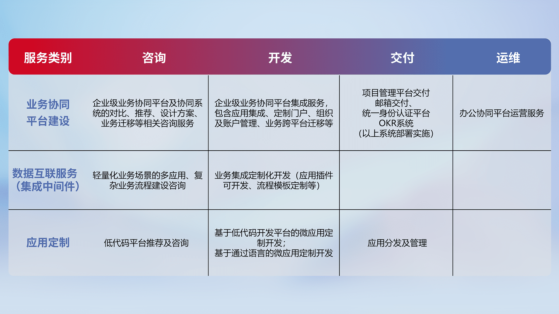 针对钉钉、、企微、、、IDaas等平台级产品提供产品的规划、、、、方案、、、交付、、、、定制化开发等服务,,,实现如统一协同办公、、智能客户服务、、、混合会议管理、、智能数据查询、、、等业务场景,,实现数字化转型。。。